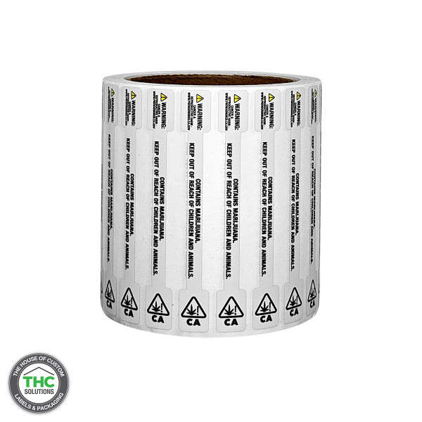 California Prop 65 Warning tamper evident label, with a silver poly void text left behind if removed.