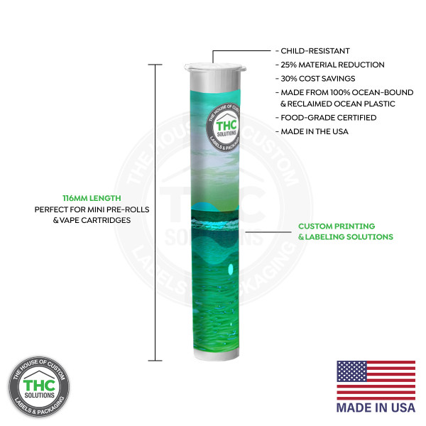 These reclaimed ocean plastic pre roll tubes are fully customizable. Make your brand stand out with your custom label design or custom tamper evident labels for your pre-roll tubes to help create a clean and sleek look.